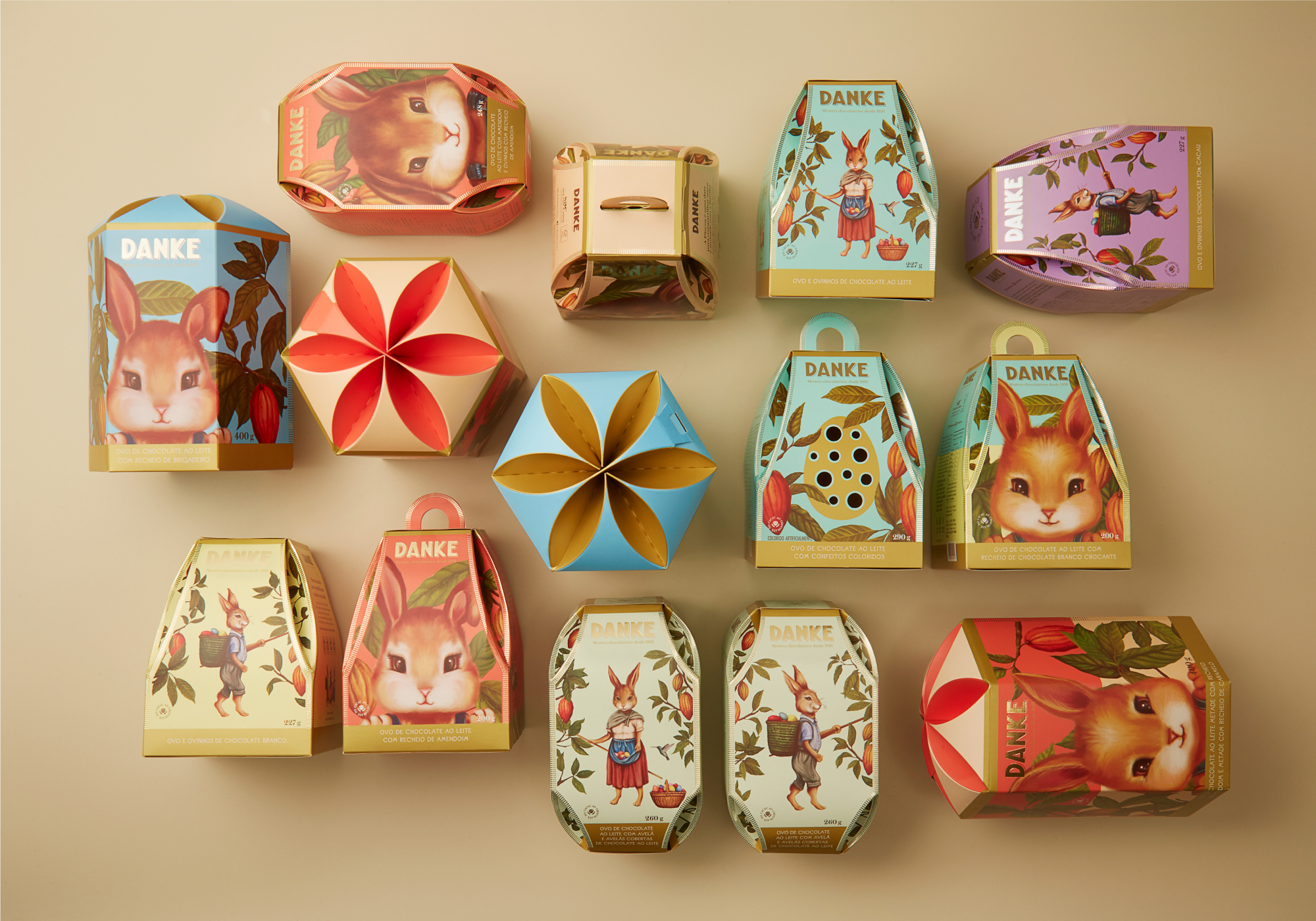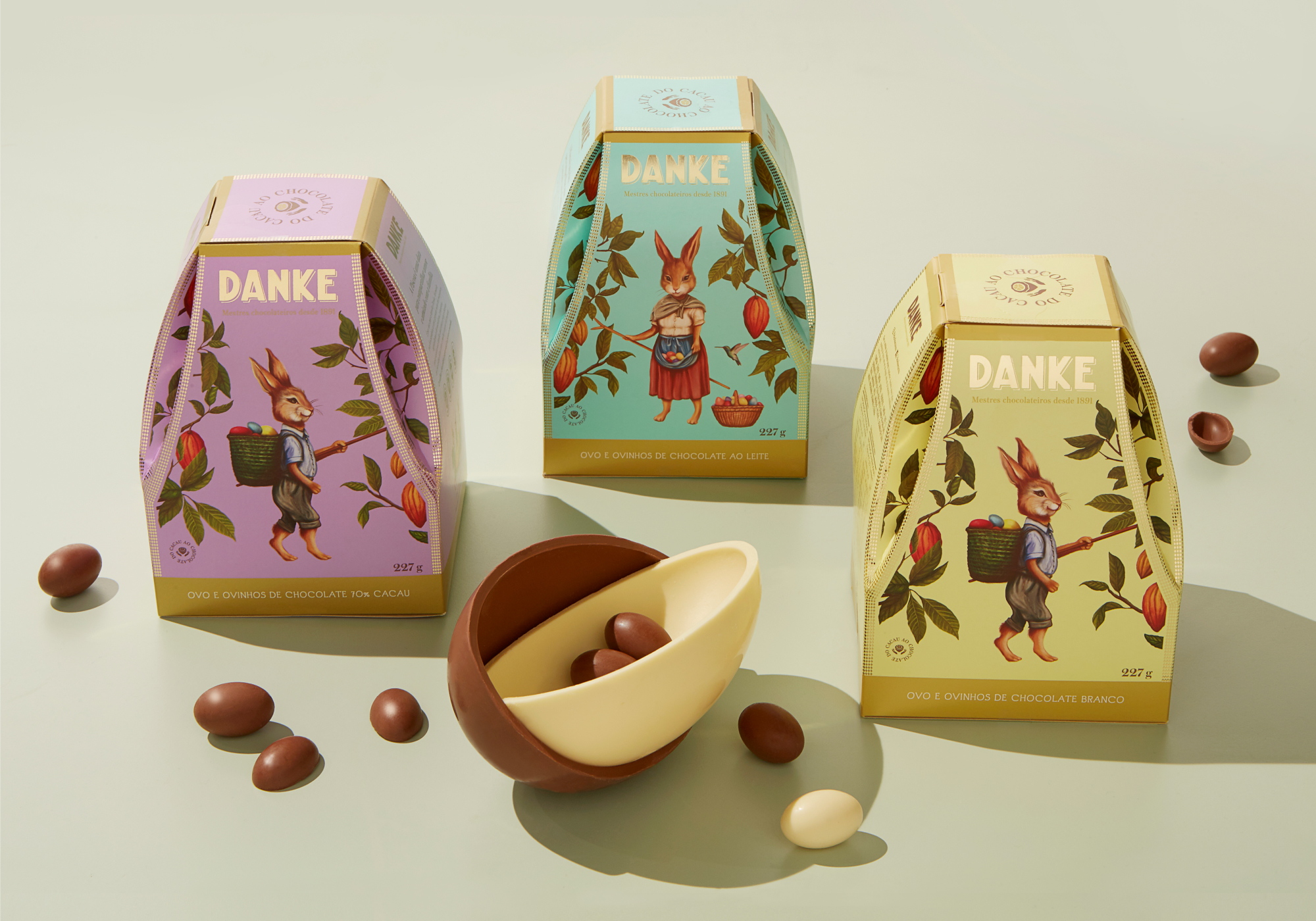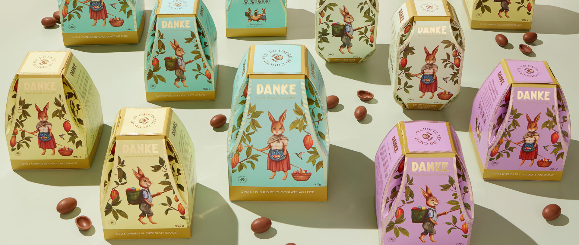 Para os sabores adultos nos inspiramos em postais do final do século XIX e criamos ilustrações vintage de coelhos humanizados trabalhando em plantação de cacau. Para a linha infantil, ilustrações na mesma linguagem, porém de closes dos coelhinhos, o que gerou grande visibilidade dos produtos nos pontos-de-venda e foi sucesso de vendas.