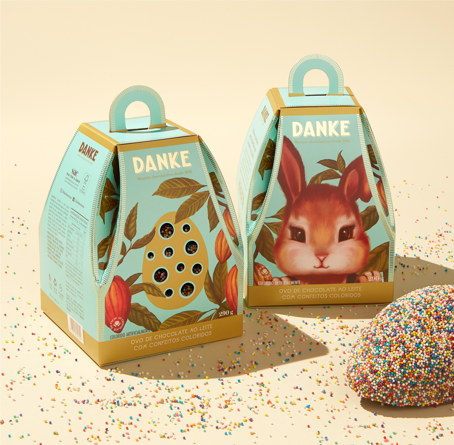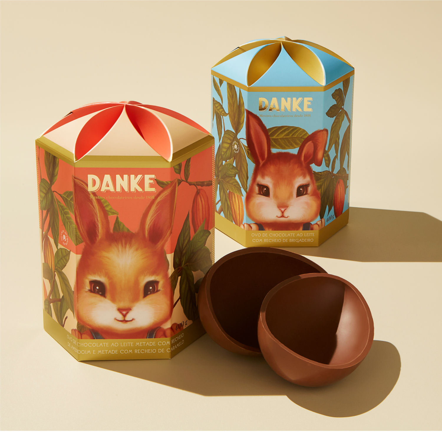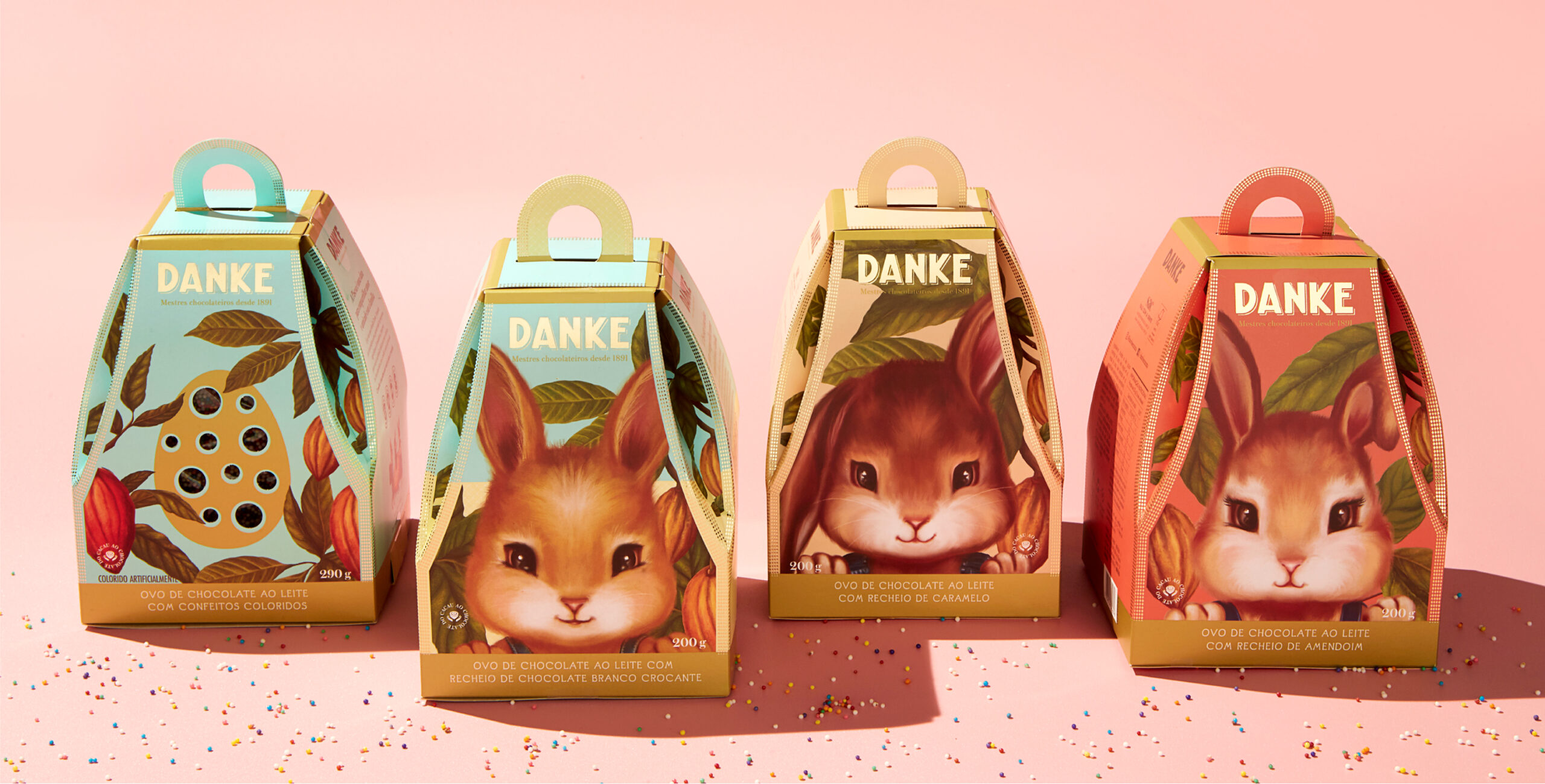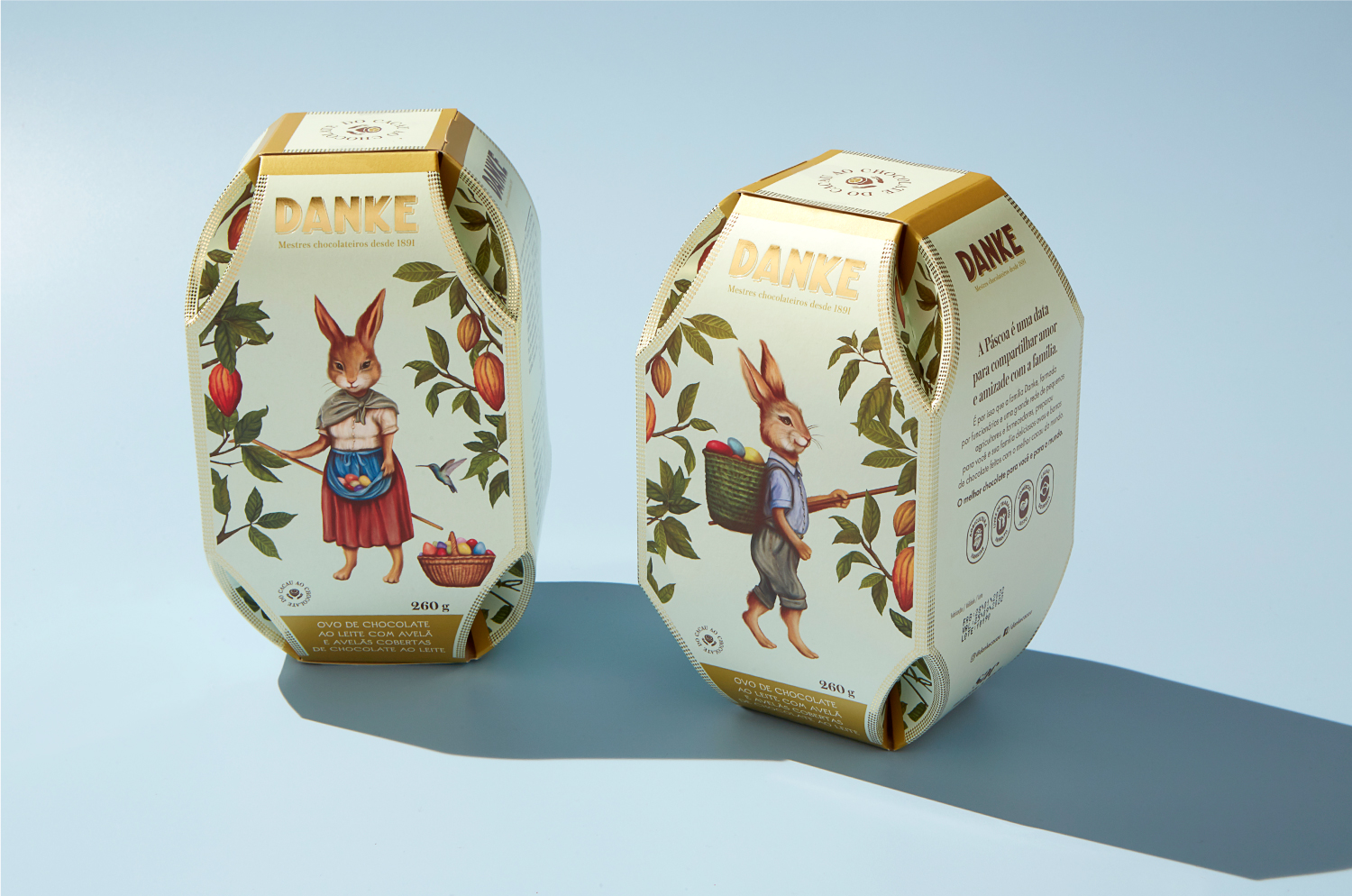 Para os sabores adultos nos inspiramos em postais do final do século XIX e criamos ilustrações vintage de coelhos humanizados trabalhando em plantação de cacau. Para a linha infantil, ilustrações na mesma linguagem, porém de closes dos coelhinhos, o que gerou grande visibilidade dos produtos nos pontos-de-venda e foi sucesso de vendas.