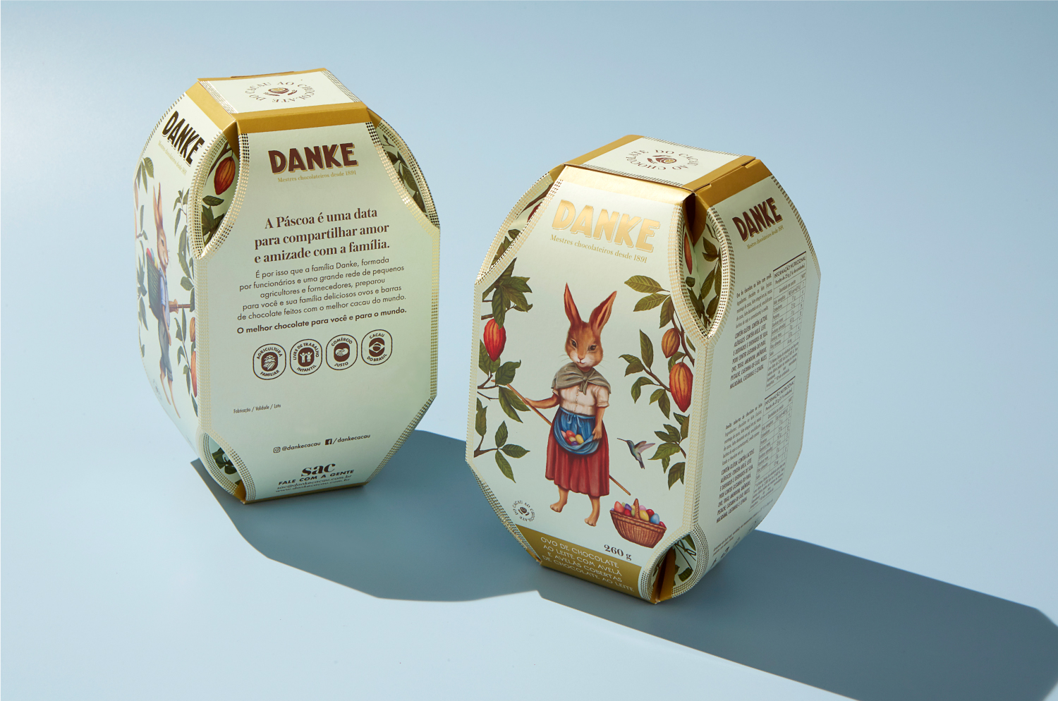 Partimos do foco da marca em família: Danke é uma empresa familiar com mais de 100 anos de tradição na fabricação de chocolate, tem compromisso com agricultura familiar no Pará e é livre de trabalho em infantil. Criamos o conceito: Páscoa com Danke. Da nossa família para a sua.